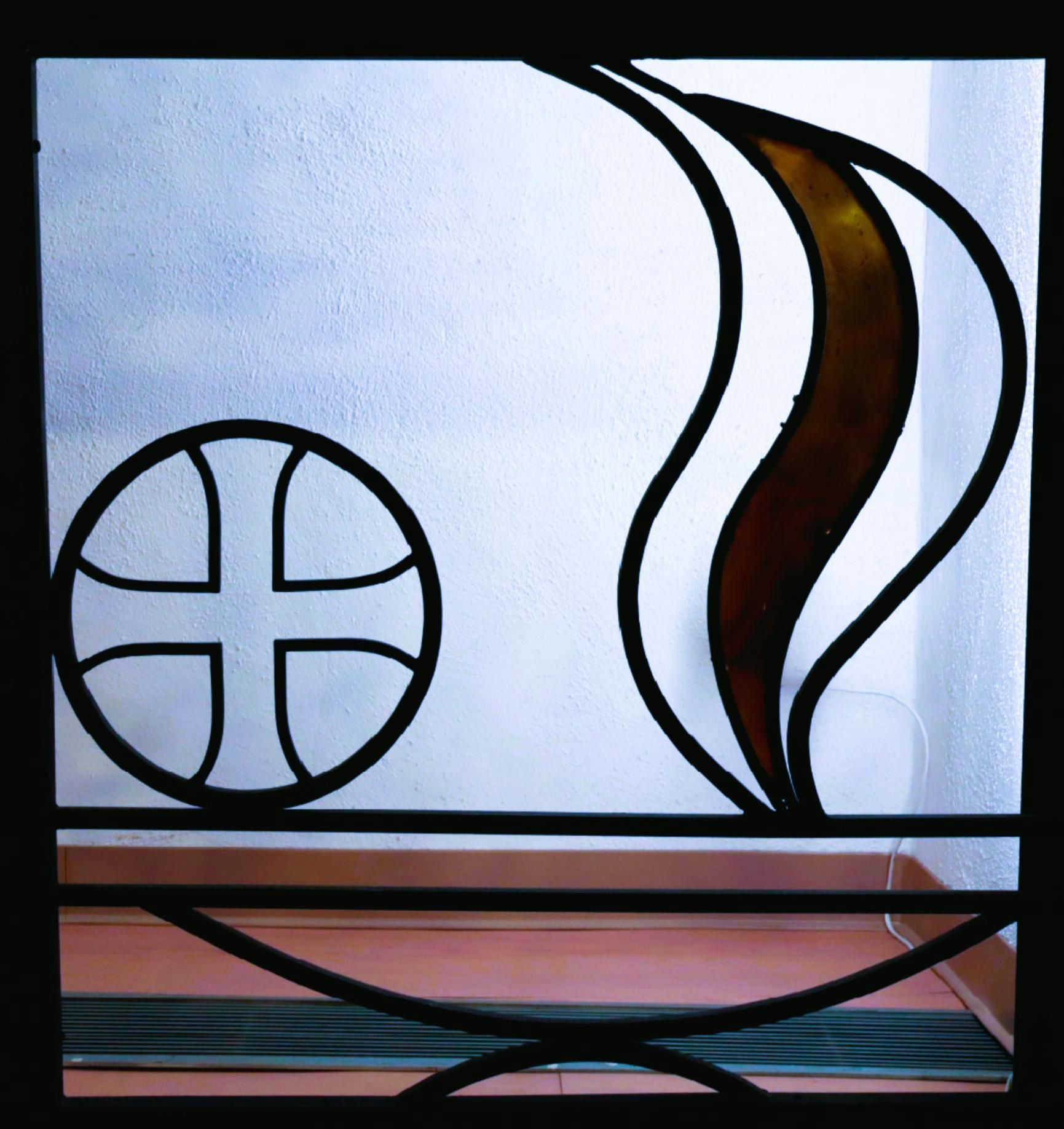 The Church is APOSTOLIC. Jesus’ closest disciples were sent by Him as emissaries to carry the Good News out into the world after His resurrection. In the Gospel of Matthew, Jesus says he will give Peter the Keys to the Kingdom of Heaven, so the Church uses keys as a symbol of her Apostolic heritage of Faith, Purpose, and Office. The “deposit of faith” established by the teachings of Jesus has been entrusted to the Church and she strives to preserve and reflect the complete faith and doctrine given to, and through, the Apostles. Christ commissioned the Apostles to proclaim the Gospel and shepherd God’s people. The Church’s enduring purpose is to faithfully carry on that mission, just as the Apostles did. The Church has maintained an uninterrupted succession from the original Apostles through its ordinations. All priests and deacons have been ordained by bishops who were themselves ordained through a direct line that traces its roots to the Apostles. Also seen in this panel is an olive branch, which is a metaphor from St Paul’s Letter to the Romans: we are the branches that are grafted onto the stem “and have come to share in the rich root of the olive tree.” The Church cares for the “roots” and facilitates each of us being “grafted on” through teaching and the Sacraments.