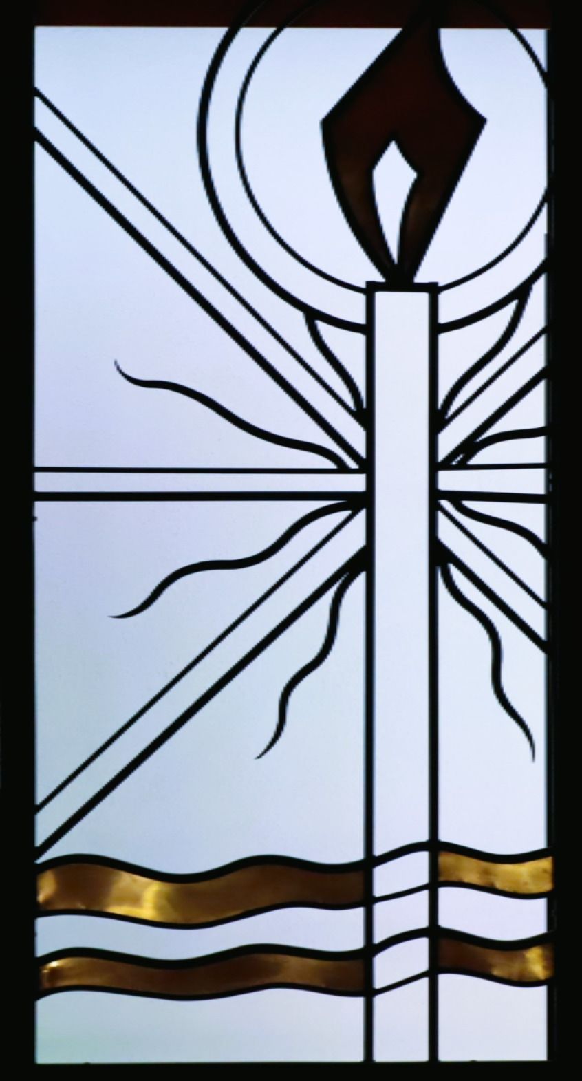 In this panel, you will also see the Easter Candle because we are not just baptized into the life of Christ, but also his death and resurrection. Parents and Godparents are given the light of Christ at their child’s baptism and instructed to keep it burning brightly so that their child may walk always as a child of the light. The path we must walk is also given to us in baptism, when we are anointed as Priest, Prophet, and King. This three-part mission means we must offer the best of ourselves up to God, always be ready to talk to and about God, and embody Christ’s example of servant leadership to use what authority and agency we have to create the Kingdom of God for all.