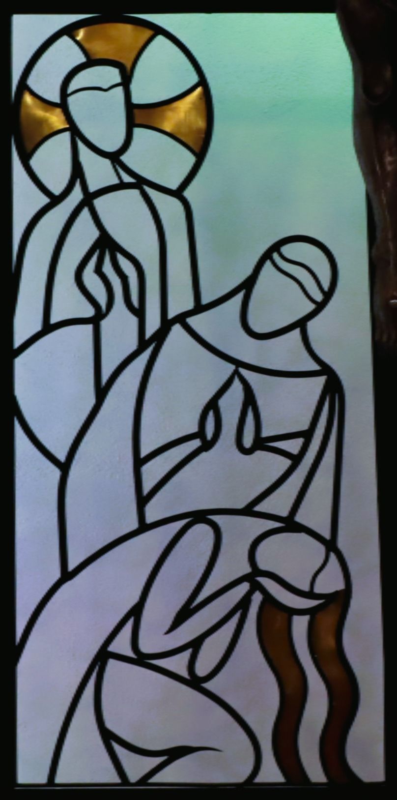 John is bowed down. Despite his own suffering, he accepts Jesus’ instruction to care for Mary as his own mother and receives the care of Mary in return. The way his head is inclined also speaks about extending that care to others as he is doing for Mary of Magdala beside him. We, too, received Mary as our Spiritual Mother and have been instructed to reach out with the care and compassion we have received, despite being bowed down by our own circumstances of suffering.