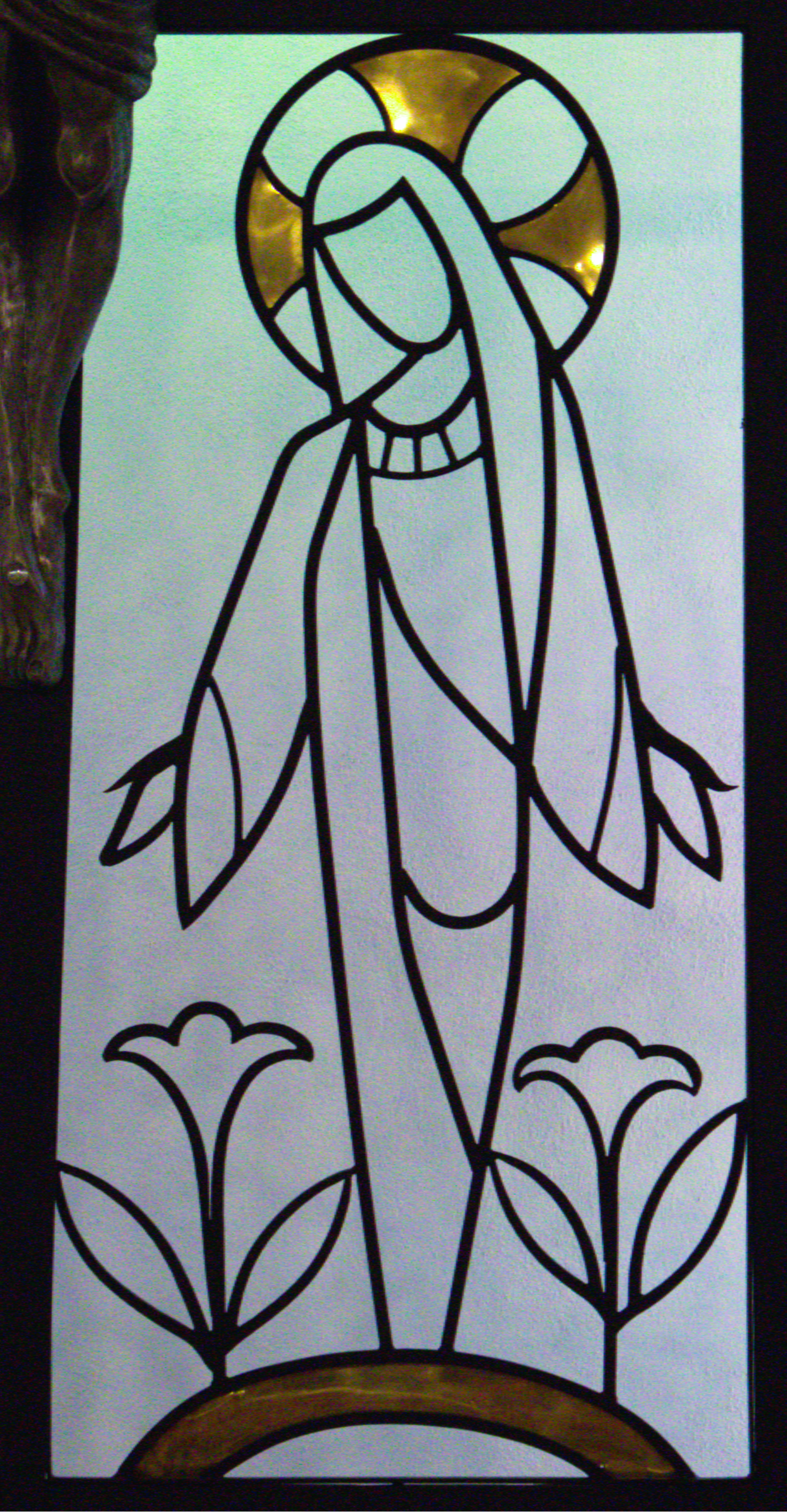 One of the central images of the Altar Screen is the central tenet of our faith: the incarnation. Jesus Christ, the Son of God, was born into the world through Mary to save humanity from sin. This depiction of Mary at the Annunciation is the turning point of our salvation. The lilies represent her purity and innocence as well as humanity’s new beginning. Mary’s arms are open in acceptance of her role as “Theotokos,” or “God-bearer.” Through her cooperation, the Word was made flesh. This image stands at the foot of the cross just as this event stood at the foot of Jesus’ life, ministry, death, and resurrection.