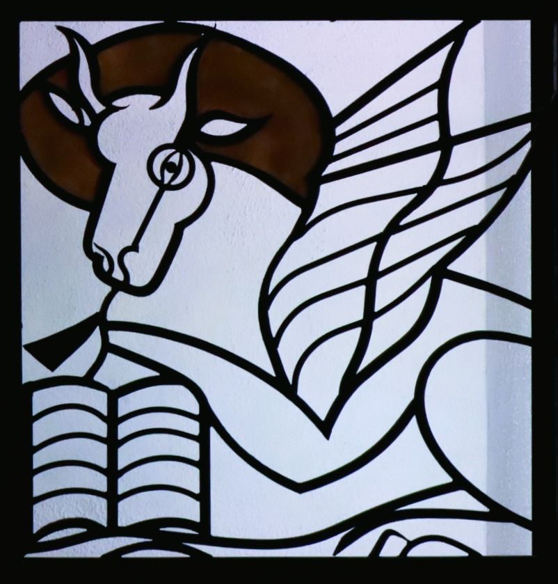 The winged ox is St Luke. The Gospel of St Luke, which is written by the same author as the book known as the Acts of the Apostles, is the last of the synoptic Gospels. The creature that represents this Gospel is the winged ox due to the use of oxen as temple sacrifices. This Gospel begins with a story about Zechariah, who had priestly duties at the temple and was the father of John the Baptist. From this beginning, Luke’s Gospel highlights the sacrificial nature of Jesus’ life and ministry and prepares us to understand the significance of his ultimate sacrifice for our sins and our salvation. Oxen are used for their strength and have a role in our service, which is how Luke portrays Jesus: as a servant leader who calls us to play a supportive role in the lives of others. Throughout the gospel, Luke calls upon the Christian disciple to identify with the master Jesus, who is caring and tender toward the poor and lowly, the outcast, the sinner, and the afflicted, toward all those who recognize their dependence on God.