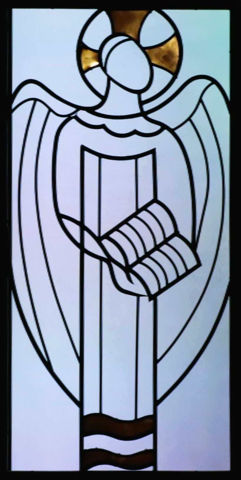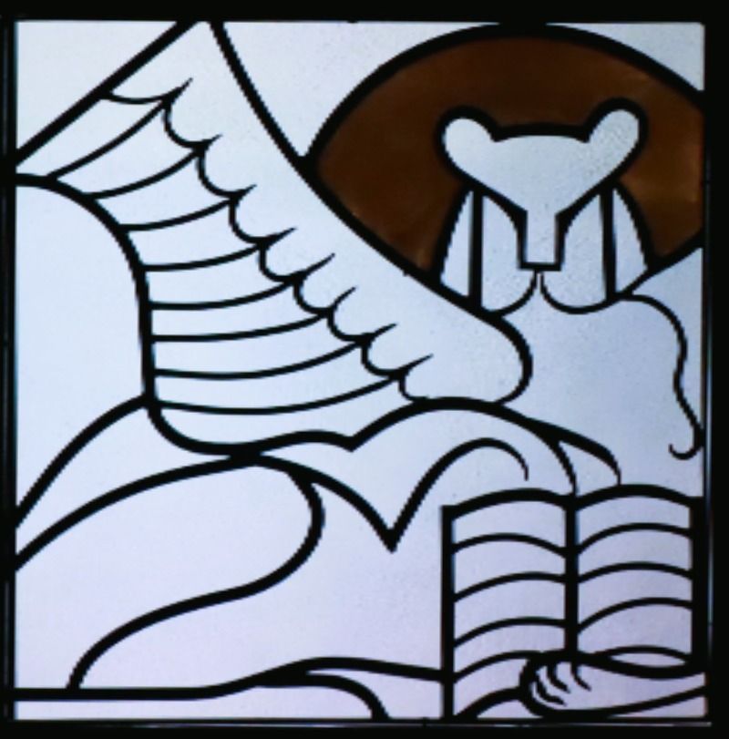 The winged lion is St Mark. Though placed second in the canon of the New Testament, it is widely accepted that Mark’s Gospel was written first among the four. It is the shortest NT Gospel and it begins with John’s preaching in the wilderness and Jesus’ baptism in the Jordan. This is one reason Mark is depicted as a Lion since John’s voice is described as a roar. Another reason for the depiction as a Lion is the energy of this Gospel. It races from event to event- identifying Jesus as the Son of God from the outset and taking the reader on a fast-paced journey to the Crucifixion and Resurrection. One more connection of Mark and his Gospel with a lion is a prophetic poem from the Book of Genesis that foretells a Messiah very much like the way Mark portrays Him: the Lion of Judah, showing courage and strength in facing opposition and death.